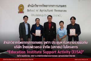 ศาสตราจารย์ นายแพทย์สมชาย ธนวัฒนาเจริญ คณบดี พร้อมทั้งผู้บริหาร คณาจารย์ เจ้าหน้าที่ สำนักวิชาทรัพยากรการเกษตร จุฬาฯ ประชุมความร่วมมือระหว่างสำนักวิชาทรัพยากรการเกษตร จุฬาลงกรณ์มหาวิทยาลัย และ บริษัท ไทยเบฟเวอเรจ จำกัด (มหาชน) ในโครงการ Education Institute Support Activity (EISA) ของบริษัท ไทยเบฟเวอเรจ จำกัด (มหาชน) เพื่อดำเนินการโครงการพัฒนานิสิตและกิจกรรมบริการวิชาการในชุมชนและโรงเรียนในจังหวัดน่านและจังหวัดใกล้เคียง ในวันศุกร์ที่ 8 พฤศจิกายน 2567 ห้องประชุม 825 ชั้น 8 อาคารจุฬาพัฒน์ 13